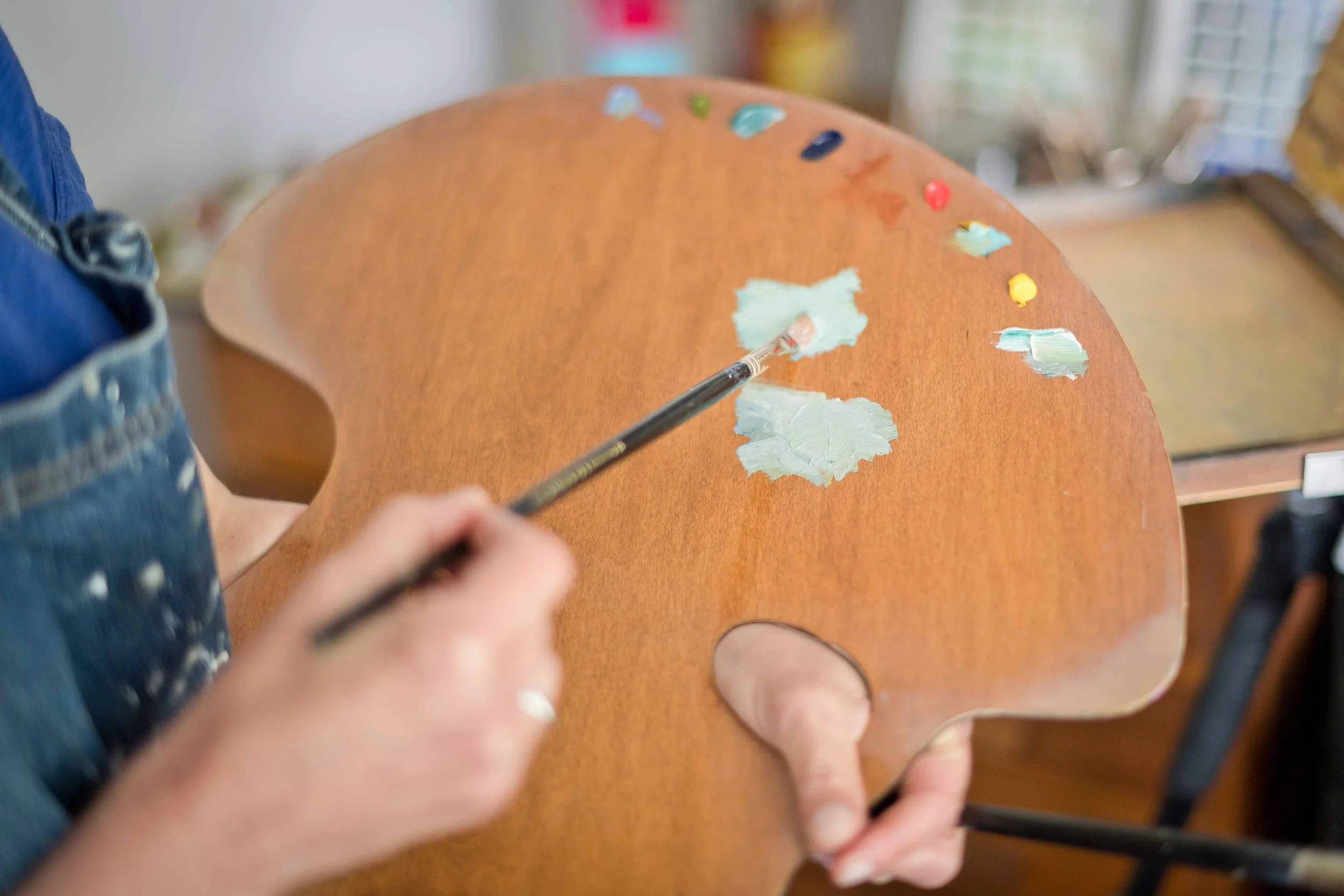I use a wooden palette made by New Wave. It is their Expressionist Confident Wood Palette (held in left hand). It has been treated so is very easy to clean. It is a great size giving me space to mix colours and lightweight to hold.